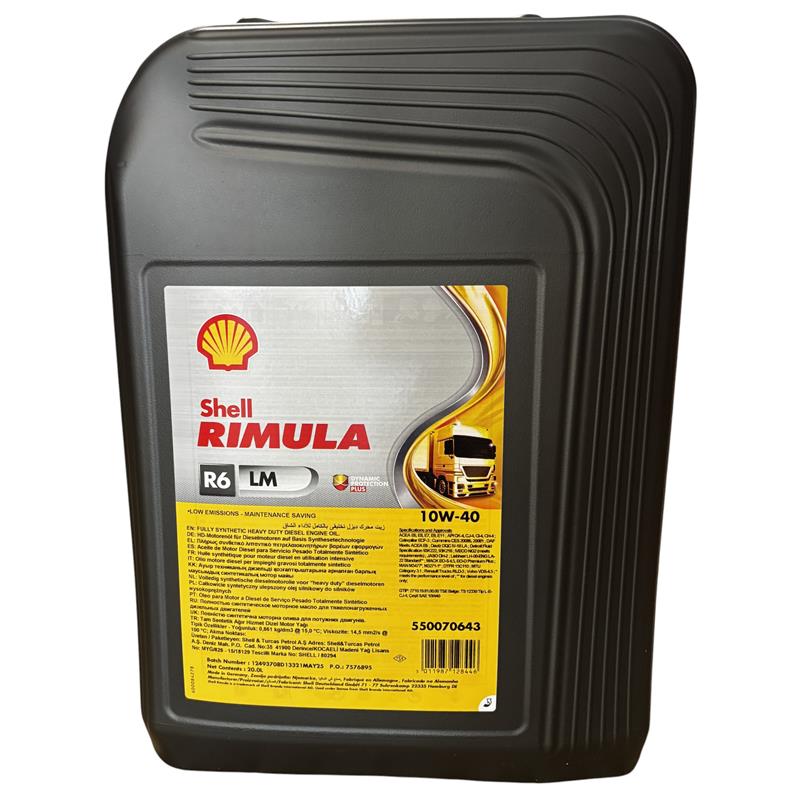 Shell Rimula R6 LM 10W-40 to syntetyczny, niskopopiołowy olej silnikowy o klasie lepkości 10W-40, zaprojektowany do nowoczesnych i wysokoobciążonych silników wysokoprężnych Diesla w pojazdach ciężarowych, autobusach, maszynach budowlanych i innych zastosowaniach wymagających dużej trwałości i ochrony.